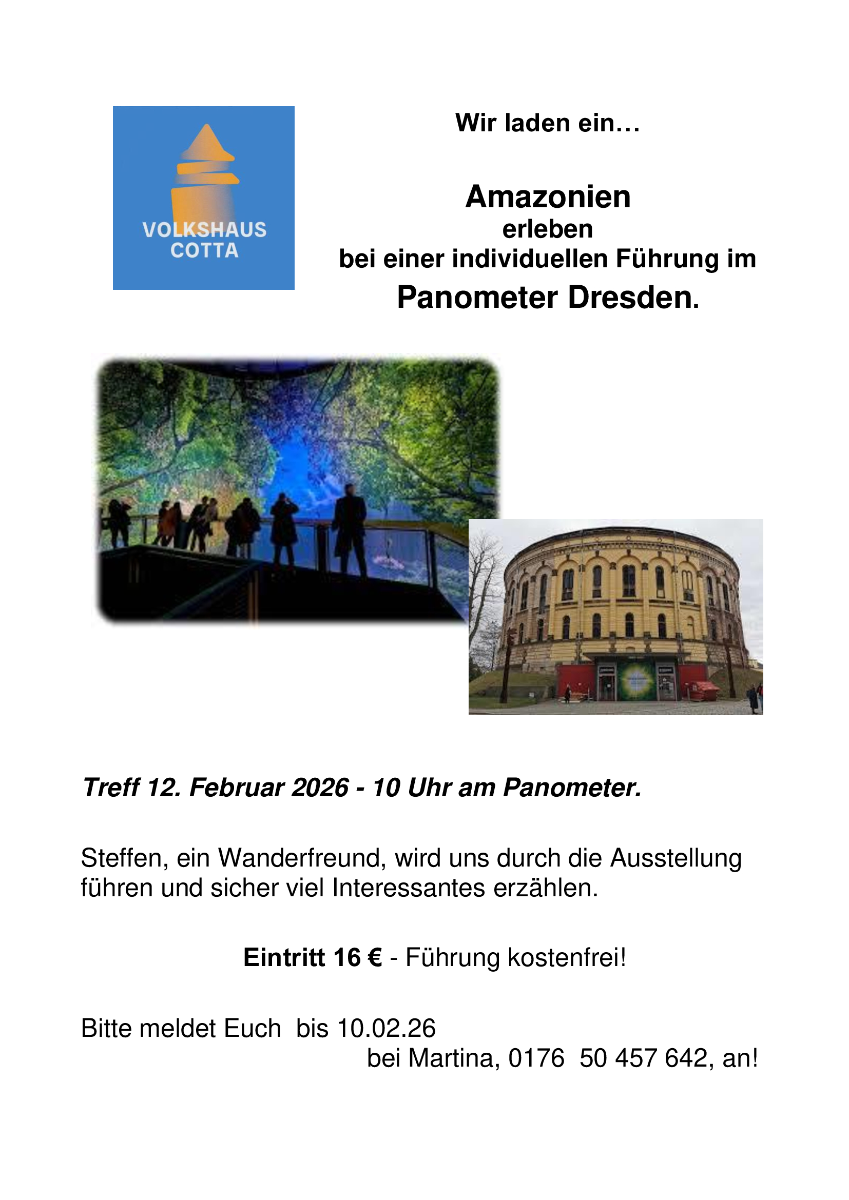 Die Wandergruppe um unsere Ehrenamtliche Martina lädt ein, gemeinsam die Ausstellung im Panometer zu besuchen. Meldet euch dazu bitte telefonisch an: 0176 504 576 42