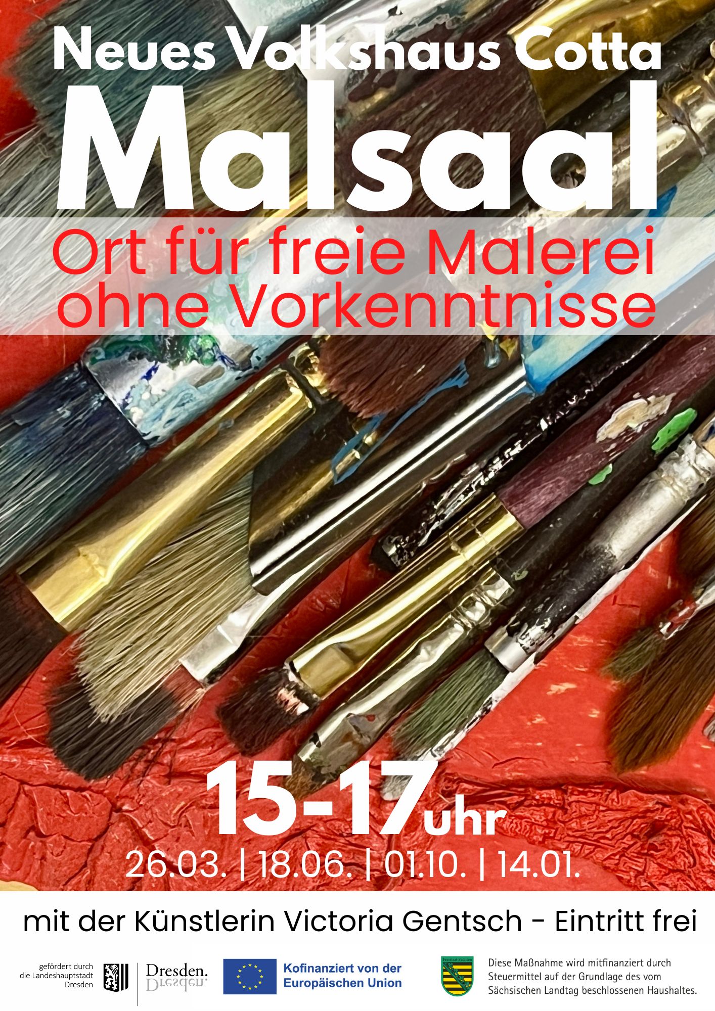 Die Künstlerin Victoria Gentsch bietet ab März ein neues Format bei uns an: einen Ort für Freie Malerei - ganz ohne Vorkenntnisse. Es gibt verschiedene Materialien und Farben und alle Teilnehmer:innen sind eingeladen, neue kreative Seiten an sich zu entdecken. Bis Janaur 2027 gibt es dann noch drei weitere Termine um neue Kenntnisse zu vertiefen und einander kennenzulernen. Victoria Gentsch arbeitet als bildende Künstlerin in Dresden und hat auch Atelierräume bei uns im Neuen Volkshaus Cotta.