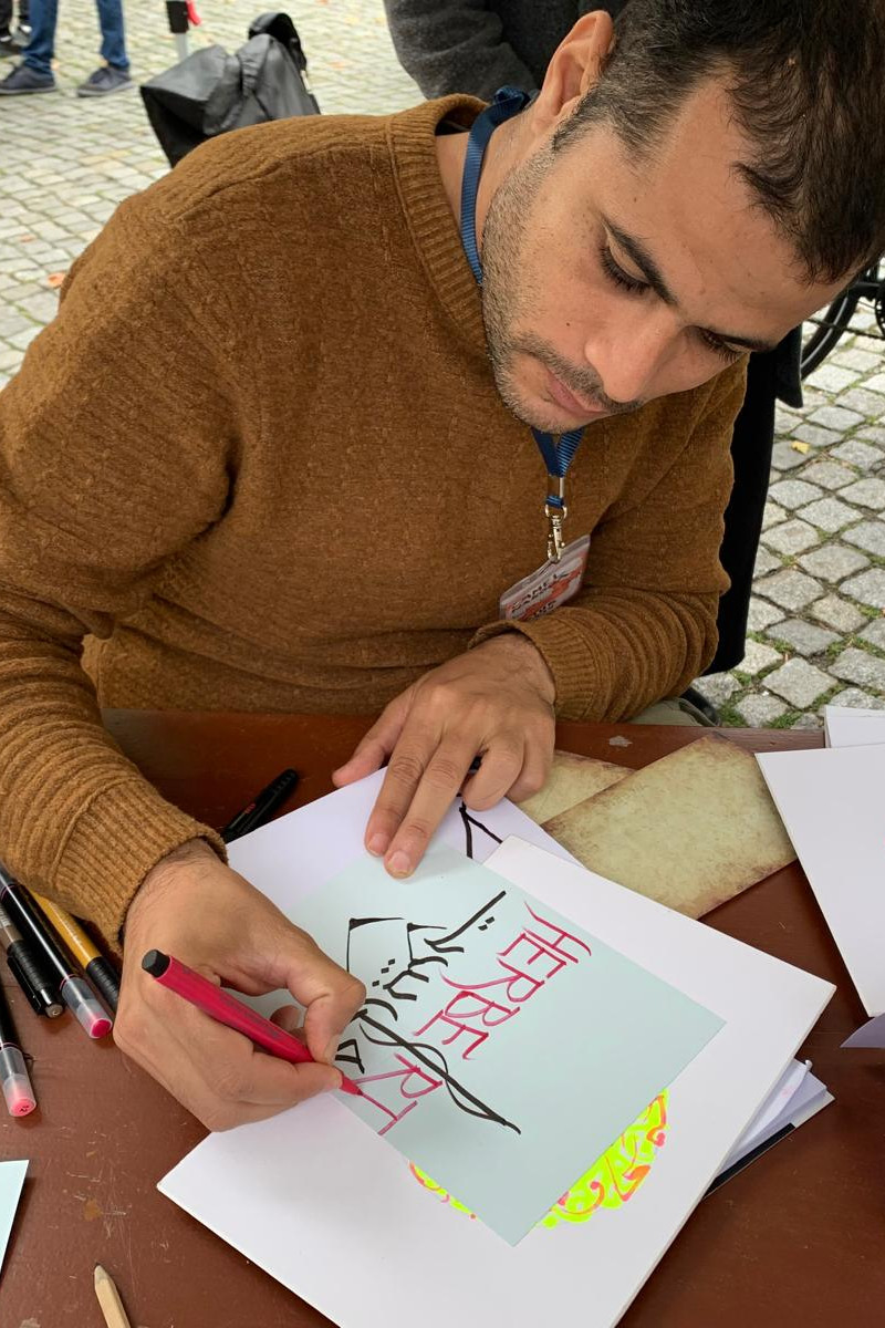 Ab April stellt der Künstler Jamel Nakoua bei uns im Saal eine Auswahl seiner Werke aus. Er ist Kalligraf sowie bildender Künstler mit Spezialisierung auf arabischer Schriftkunst. Seine künstlerische und suchende Tätigkeit widmet sich der Entwicklung ästhetischer und formaler Ansätze der arabischen Schrift, ihrer Dynamik sowie der Beziehung zwischen Lesbarkeit und Unlesbarkeit.