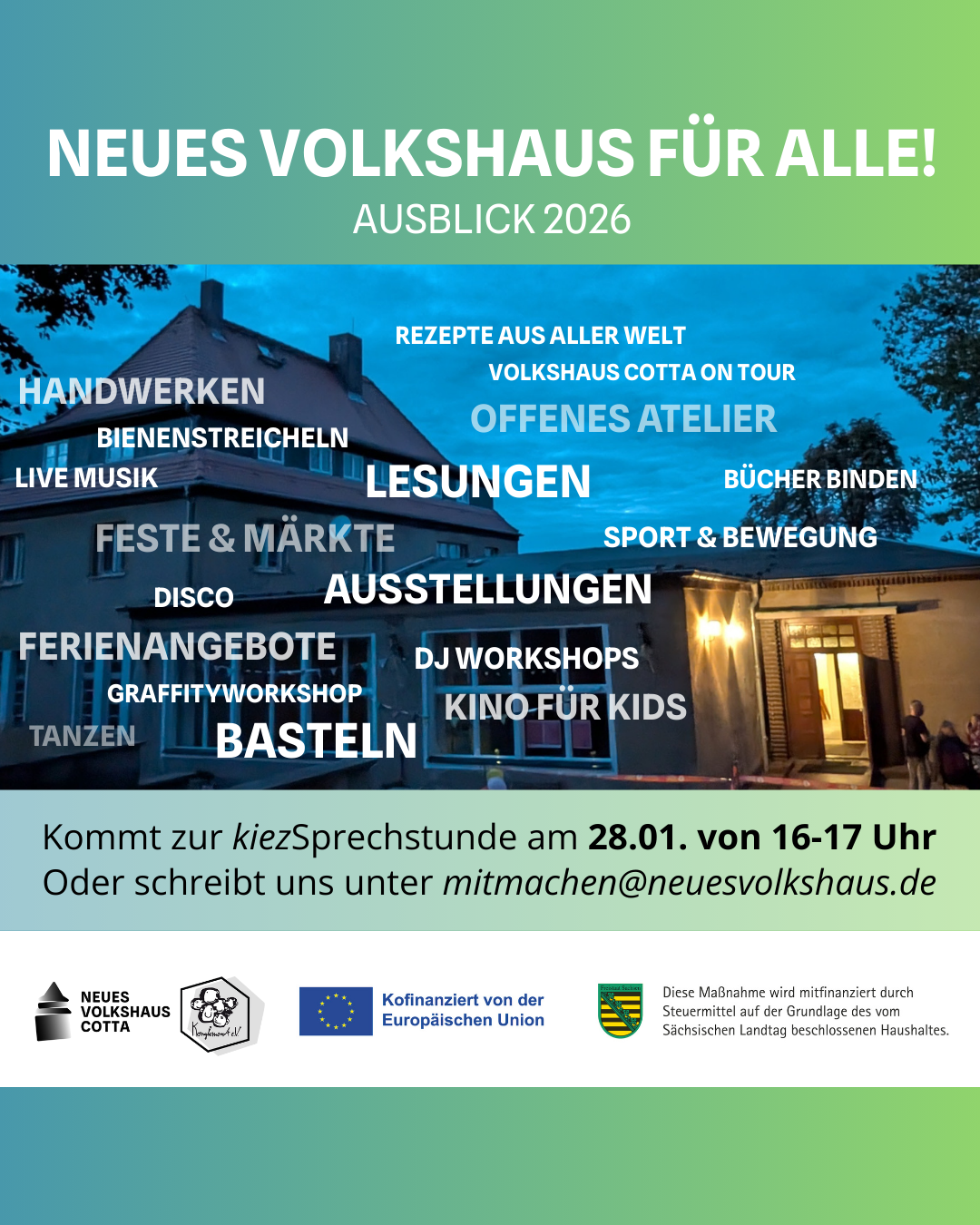 Wir haben viele Ideen und freuen uns, wenn ihr mitmachen oder unterstützen möchtet. Meldet euch gern unter mitmachen@neuesvolkshaus.de oder kommt zur kiezSprechstunde am 21.01. von 14 - 17 Uhr im VHC.